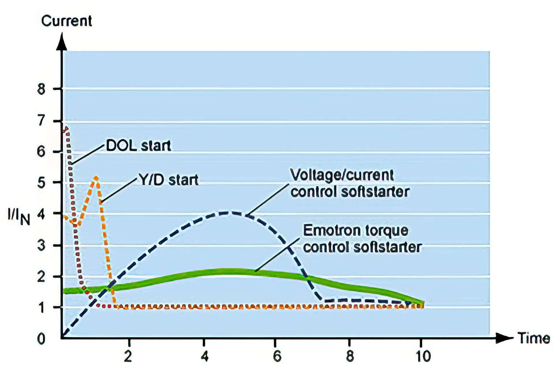 The logic-based torque ramp technology uses a control algorithm to maintain constant acceleration and deceleration torque. Motor voltage, motor flux, current and voltage zero-crossing are used to determine the torque and power factor. The Emotron softstarter uses data to continuously calculate actual shaft torque. Torque ramps can be configured for variable or constant torque loads. Square torque control can be used for pumps and fans.