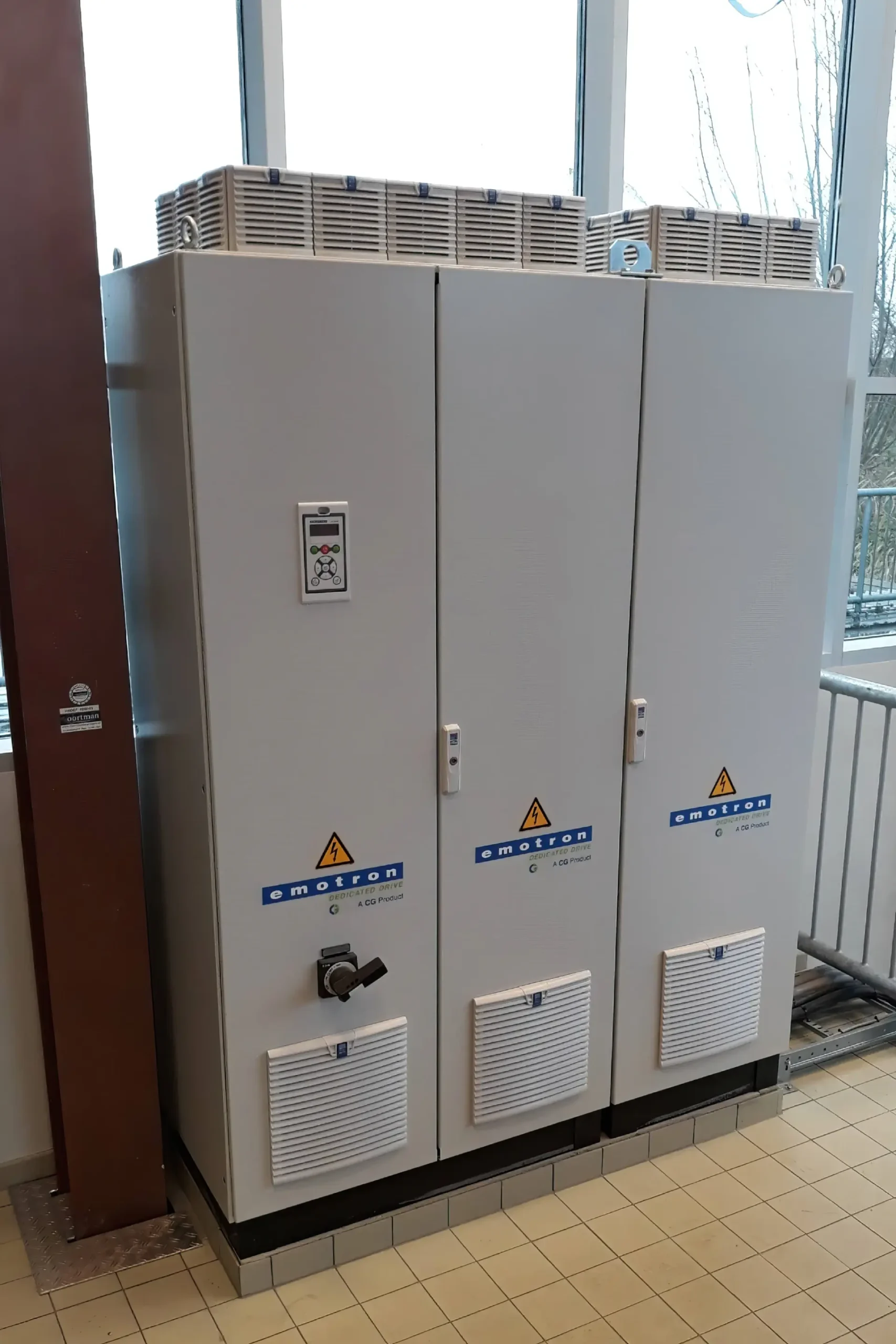 The generated energy is fed back to the grid via the Emotron AFE (Active front end) variable frequency drive VFXR 2.1